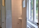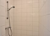 Badkamer voorzien van douchehoek en vaste wastafel in een frisse kleurstelling. Toilet met fontein, eveneens in lichte kleurstelling. Bijkeuken met aansluiting wasautomaat, uitstortgootsteen en de plaatsing van de NEFIT Hoog Rendement CV-combiketel van 2024.
