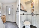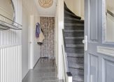 Via de mooie voordeur is de hal te bereiken die, net als de rest van de woning, smaakvol is verbouwd. Op de vloer liggen robuuste plavuizen, dat goed past bij het behang en de houten betimmering op de muren. Rechts in de hal zijn de trapopgang, toiletruimte en er is een trap naar de wijn-/trapkelder.