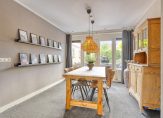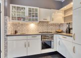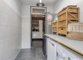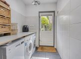 In de woonkamer is een brede doorgang naar de keuken, waar dezelfde vloer als de hal ligt. De hoekopstelling heeft een ingebouwde gaskookplaat, afzuigkap en een koelkast. Erg praktisch is de ruime, verwarmde bijkeuken met ruimte voor de wasmachine, droger, vaatwasser en een vriezer.