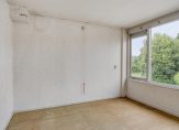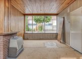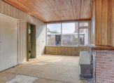 Ook de woonkamer is toe aan een algehele verbouwing. Een gaskachel heeft jarenlang gezorgd voor verwarming en een deel van de muren is, net als het plafond, betimmerd met hout. Kies je voor het zitgedeelte aan de voorzijde en het eetgedeelte aan de achterzijde? Of andersom? Ook een uitbouw behoort tot de mogelijkheden.