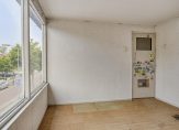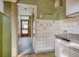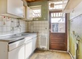 Vanuit de hal en woonkamer is de keuken te bereiken, met een eenvoudige wandopstelling zonder apparatuur. Boven de spoelbak hangt een boiler en aan de andere zijde is de wasmachineaansluiting. Via de buitendeur loop je naar de tuin en de (fietsen)berging.