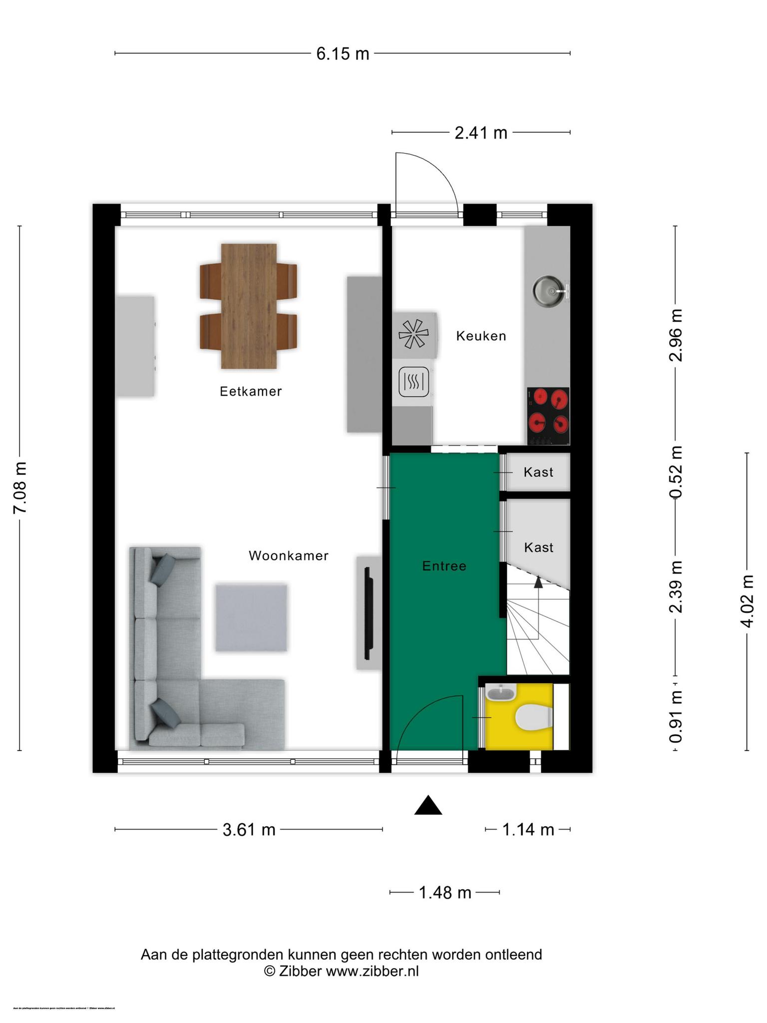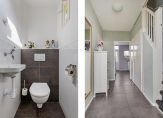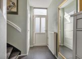 De eerste indruk is goed, met rolluiken bij de kunststof kozijnen en een donkergroene voordeur. Ook in de hal bepaalt groen, in een lichtere tint, de sfeer. De donkere tegelvloer past goed bij het tapijt op de trap en de witte paneeldeuren. Rechts in de hal zijn een bergkast, trapkast en de toiletruimte met fonteintje.