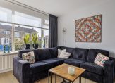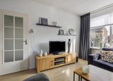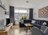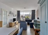 In de gezellige woonkamer zorgen grote ramen aan de voor- en achterzijde voor veel lichtinval. Het zitgedeelte is aan de voorzijde, met uitzicht naar de brede straat, en het eetgedeelte biedt ruimte aan een grote eettafel, dressoir en een servieskast. Op de vloer ligt laminaat, die qua kleur bij verschillende interieurstijlen past.