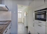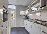 In de keuken ligt dezelfde, antracietkleurige tegelvloer als de hal. Na een paar stappen sta je, met een drankje en een hapje, in de tuin. De dubbele wandopstelling (2010) biedt veel praktische bergruimte en het aanrechtblad is uitgevoerd in een bruine houtlook. Alle benodigde apparatuur is ingebouwd: een inductie kookplaat (2023), afzuigkap, combi-oven/magnetron, vaatwasser (2020) en een koel-/vriescombinatie.
