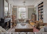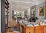 Aan de rechterzijde is de sfeervolle woonkamer, die aan de achterzijde is vergroot met een lichte serre. De woonkamer heeft hoge stijlplafonds, een visgraat parketvloer en een marmeren schouw waar nu een elektrische inzethaard is geplaatst. De serre, met prachtig plafond en visgraat parketvloer, biedt aan drie kanten uitzicht naar de tuin en heeft openslaande deuren naar het terras.