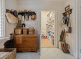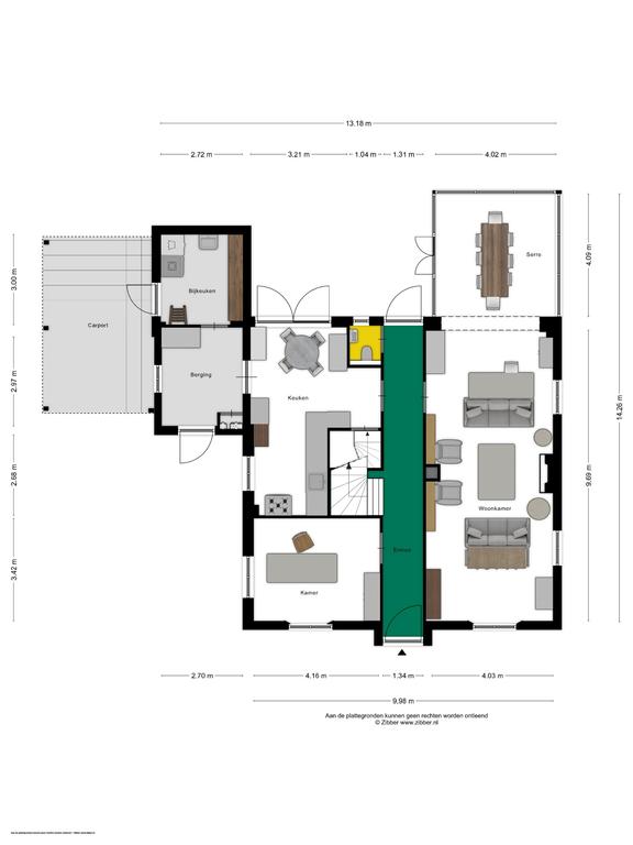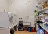 Achter een van de deuren in de keuken is een trap naar de wijn-/provisiekelder. Links van de keuken zijn een hal met eigen entree en een bijkeuken/wasruimte, die toegang biedt tot de carport.