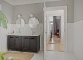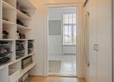 Aan de overloop grenzen drie royale slaapkamers. De master-bedroom met kleedruimte, inbouwkasten en eigen badkamer bevindt zich aan de rechterzijde. In de badkamer is licht marmer gebruikt en de ruimte is ingedeeld met een inloopdouche, wandcloset en een dubbel wastafelmeubel.