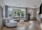 De woon-/eetkamer, royaal van formaat, heeft een speelse indeling en een optimale verbinding met de tuin. Aan de voorzijde is het zitgedeelte, het tv-gedeelte is aan de achterzijde en de royale erker is ingericht als eetgedeelte. Sfeermakers zijn het kleurrijke glas in loodraam, de houten vloer en de inbouw gashaard bij het tv-gedeelte.