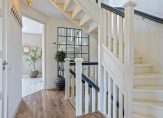 Op de eerste verdieping heb je, net als beneden, niet het idee dat je in een villa bent die pas 20 jaar oud is. Paneeldeuren en het prachtige trappenhuis bepalen de sfeer op de overloop.