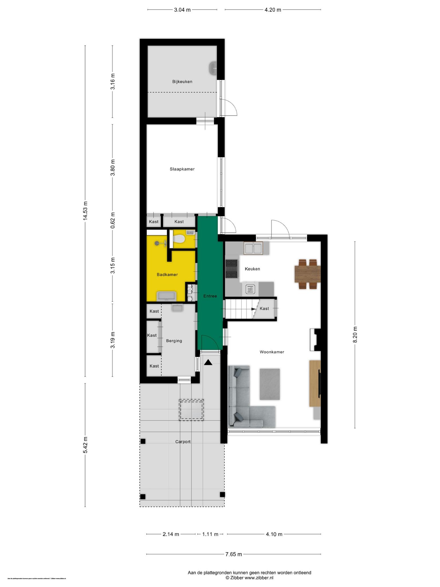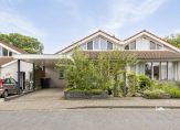 De voortuin met veel groen en drie lange, vierkante houten palen zorgt ervoor dat er weinig inkijk in huis is. Dankzij de oprit met carport is parkeren op eigen terrein altijd mogelijk.