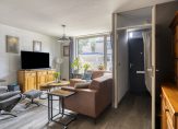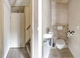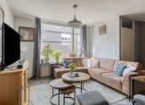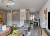 Aan de voorzijde, op het zuiden, is de woonkamer. Onder de trap is een bergkast, en achter de andere deur is een portaal met de in 2020 vernieuwde toiletruimte. Omdat de eettafel naast de keuken staat, kan de woonkamer geheel als zitkamer worden ingericht.