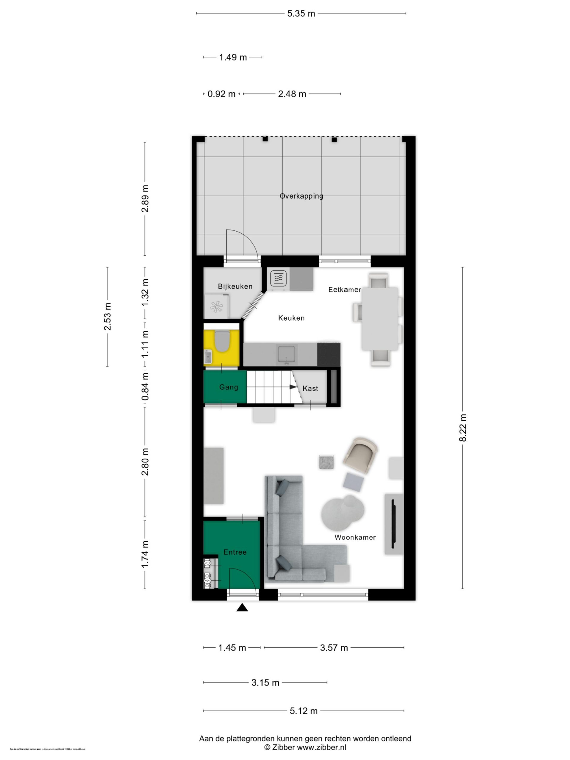 Via de zonnige voortuin, waar nu een picknickbank staat. Loop je naar de voordeur van deze leuke woning. In de hal, aan de linkerzijde, zijn de meterkast en een nis voor de kapstok. Er ligt laminaat op de vloer, net als in de woonkamer en keuken.