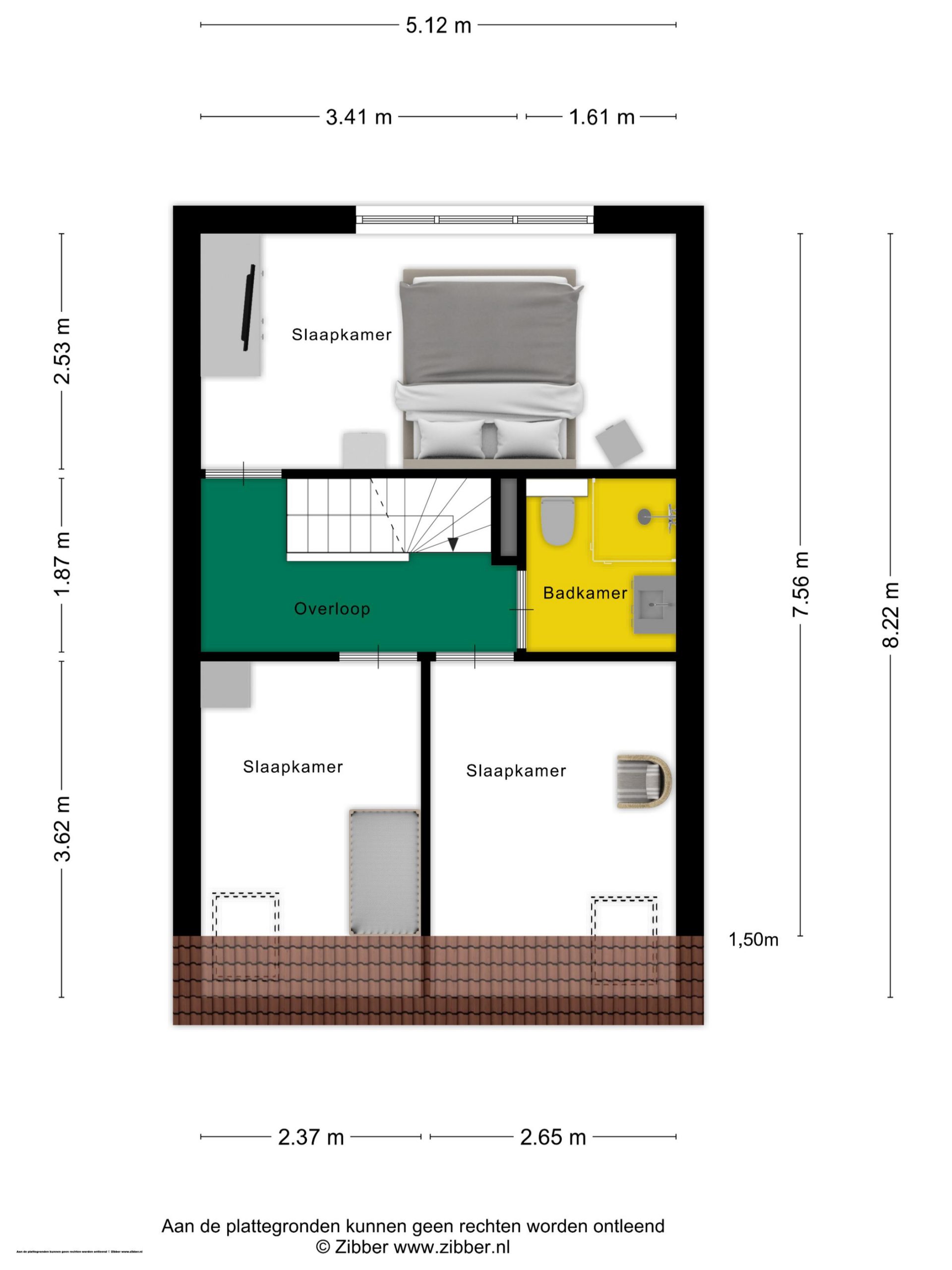 Aan de voorzijde zijn twee slaapkamers, beiden met een dakraam. Deze kamers zijn onder andere geschikt als kinderkamer, werkkamer of kleedruimte. De hoofdslaapkamer is aan de achterzijde, over de hele breedte van het huis. Het uitzicht vanuit deze kamer, richting de bomen rondom de Groene Kamer, is fraai. In 2020 is de badkamer, net als de toiletruimte, vernieuwd. De inloopdouche met schuifwand is ruim, en verder zijn er een wandcloset en een wastafelmeubel met spiegelkast. Het tegelwerk op de wanden en vloer vormt een mooi geheel met het sanitair en het plafond voorzien van inbouwverlichting.