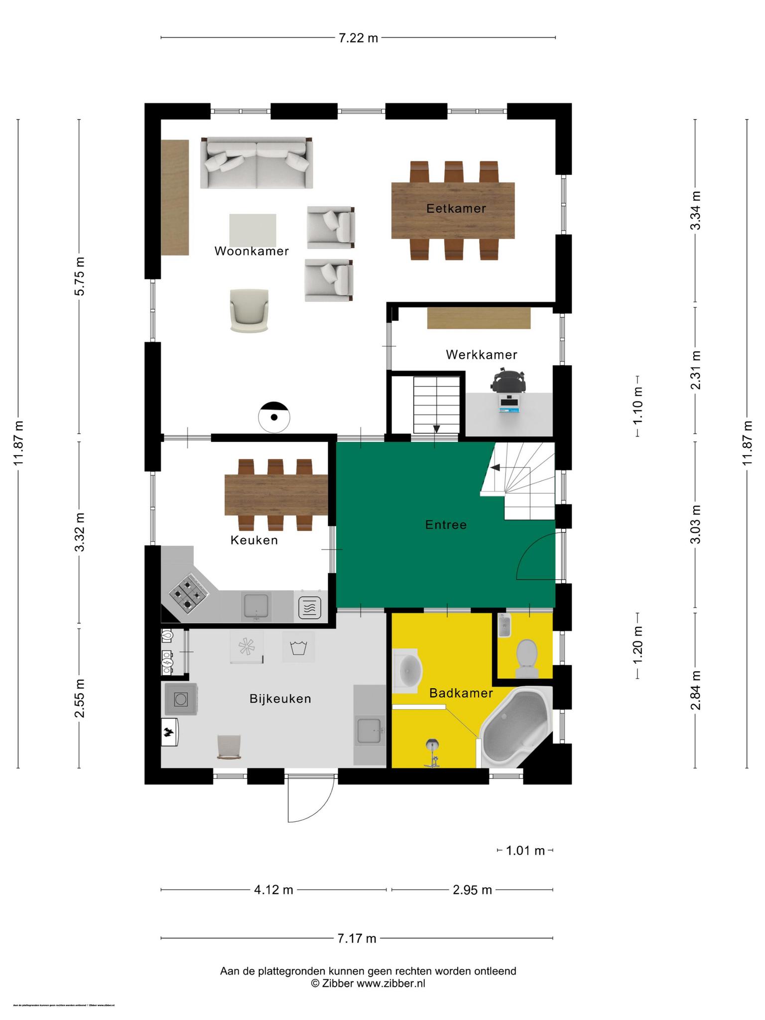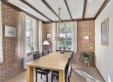 In de hal zijn de open, houten trap naar de eerste verdieping en maar liefst zes deuren. Een van deze deuren geeft toegang tot de wijn-/provisiekelder. Naast deze trap is de L-vormige woon-/eetkamer, met lichtinval aan drie kanten en prachtig uitzicht naar de tuin. Blikvangers zijn de glas-in lood bovenramen en de houtkachel, die de ruimte snel verwarmt waardoor de radiatoren uit kunnen blijven. Een mooi, origineel detail is de opkamer, die als thuiswerkplek is ingericht.