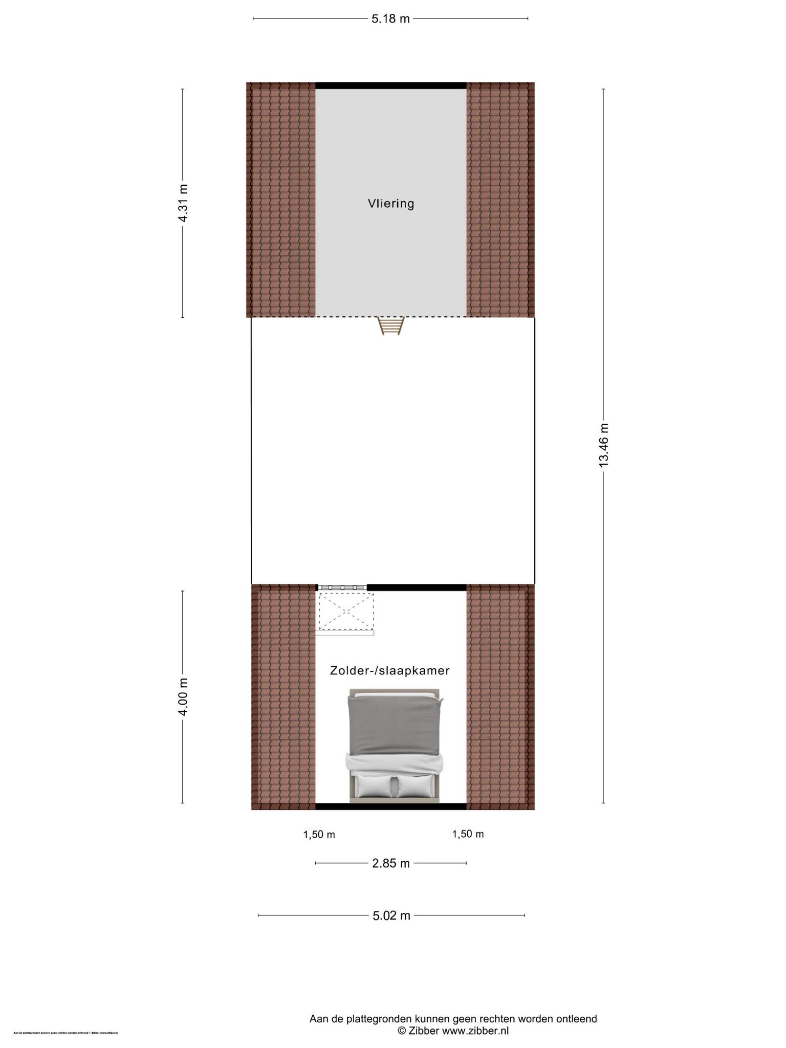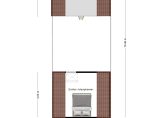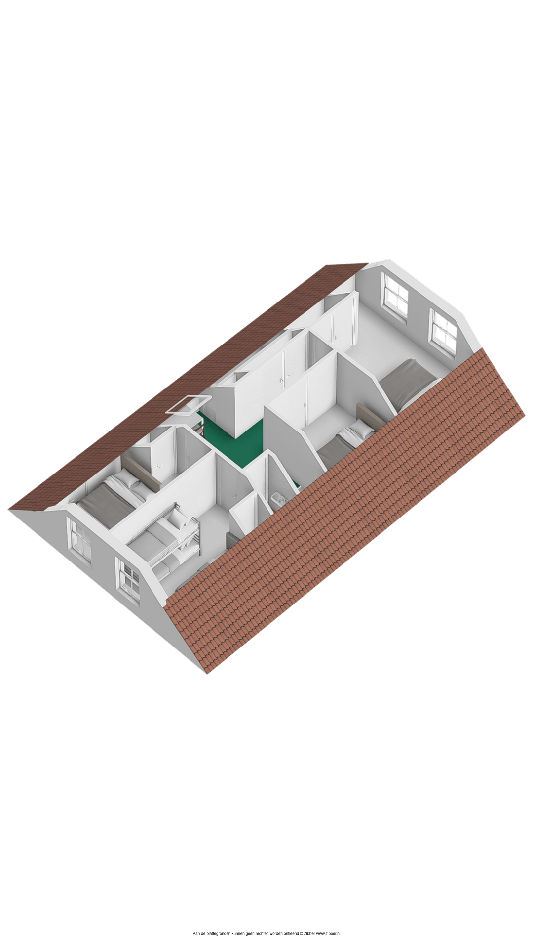 Volg de trap in de hal, die leidt naar een ruime overloop. Bij het dakraam is plek voor een bureau en verder zie je een brede garderobekast en een lage deur naar een van de bergingen in de schuinten van het dak. Naast de trap is, heel handig, een toiletruimte.
