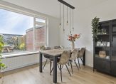 Begane grond: De hal heeft, net als de rest van de woning, veel sfeer. De lichte tegelvloer ligt niet alleen in de hal, maar ook in de toiletruimte met fonteintje. Op de trap ligt tapijt en er is genoeg plek voor een kapstok. Grote ramen in de woonkamer zorgen voor veel lichtinval en mooi uitzicht naar de voor- en achtertuin. Het zitgedeelte is aan de voorzijde en het eetgedeelte aan de achterzijde, naast de keuken.