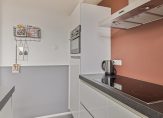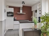 In de keuken staat een mooie, moderne opstelling uit 2018. Aan de kant van de woonkamer is het spoelgedeelte en tegen de andere muur het kookgedeelte. Brede lades en kasten bieden ruimte aan je keukenspullen en alle benodigde apparatuur is ingebouwd: een inductie kookplaat, afzuigkap, combi-oven, koelkast en een vaatwasser.