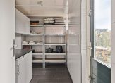 Vanuit de keuken is de geïsoleerde bijkeuken te bereiken, met geheel betegelde muren en een donkere tegelvloer. Deze ruimte is het perfecte verlengstuk van de keuken.