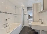 Wat voorheen een slaapkamer was, is verbouwd tot ruime badkamer. Je ziet mooie wand- en vloertegels, een verlaagd plafond met inbouwverlichting en het raam zorgt voor veel lichtinval. De ruimte is ingedeeld met een ligbad, aparte douche, tweede toilet en een wastafel. De spiegelkast en hoge wandkast bieden veel bergruimte.