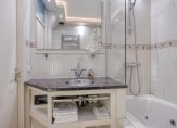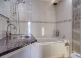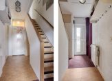 Vanaf het hofje loop je naar de voordeur van deze courant ingedeelde woning. In de hal zie je de trapopgang en de meterkast. Op de vloer ligt vinyl, wat ook is gebruikt als afwerking van de trap. Recht voor je is de badkamer, te herkennen aan de schildering op de deur. Deze ruimte is ingedeeld met een whirlpoolbad, een wandcloset en een wastafelmeubel met ‘marmeren’ blad. In 2004 is de badkamer geplaatst en in 2014 zijn de kranen vernieuwd.