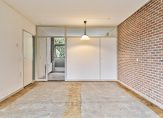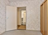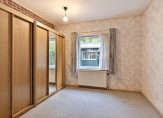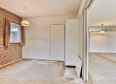 Naast de keuken is de tweede slaapkamer, met uitzicht naar de achtertuin. De grote kastenwand met spiegeldeur blijft achter en ook hier is het originele houten kozijn vervangen door een kunststof kozijn met draai-/kiepraam.