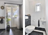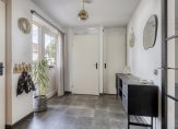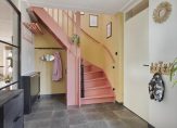 Vanaf de oprit is het een paar stappen naar de overdekte entree van deze fraaie, ruime en lichte woning. In de hal ligt een donkere vloer en de trap is geschilderd in een opvallende, maar mooie roze tint. Onder de trap is bergruimte gerealiseerd. Aan de andere zijde van de hal, naast de meterkast, is de toiletruimte met fonteintje.