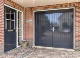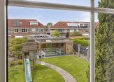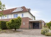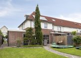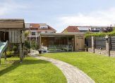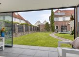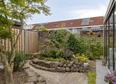 Naast de garage is een eigen achterom, die de achtertuin met de oprit en voortuin verbindt. Er kunnen twee auto’s op eigen terrein staan, en ook in de voortuin is veel groen te zien. Zo heeft de tuin, net als het woonhuis, een mooie uitstraling!