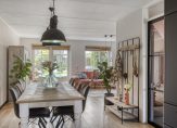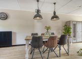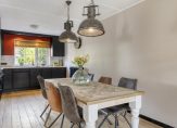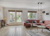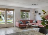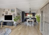 De tuingerichte woonkamer vormt een geheel met de royale eetkeuken, waarvan het kookgedeelte aan de voortuin grenst. Een van de sfeermakers is de houten vloer, en in de woonkamer valt het daglicht vanaf de westkant naar binnen. Dit betekent dat je in de keuken kunt genieten van de fijne ochtendzon.