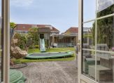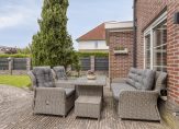 Openslaande deuren in de woonkamer geven toegang tot de zeer ruime en fraai aangelegde achtertuin op het westen. Vanaf het terras bij het woonhuis leidt een pad naar een prachtige tuinkamer, die dankzij de glazen schuifwand een groot deel van het jaar te gebruiken is. Verder zie je veel groen in de tuin, van gras tot struik en lage boom.