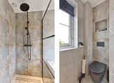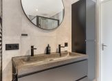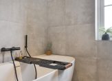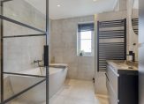 In 2023 is de badkamer vernieuwd, met een fraai eindresultaat. Hier heb je de beschikking over een heerlijk bad, een inloopdouche en achter het muurtje is het toilet. Ook hangt er, naast de zwarte handdoekenradiator, een fraai wastafelmeubel met een ronde spiegel.
