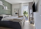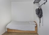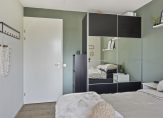 Deze bungalow heeft twee slaapkamers van circa 12.1 en 8.8 m². De grootste slaapkamer, met een raam tot vloerhoogte, bevindt zich aan de voorzijde, biedt uitzicht naar het groen aan de overzijde van de weg. Aan de andere zijde van de hal is de tweede slaapkamer die nu als logeerkamer, kleedruimte en hobbyruimte in gebruik is.
