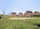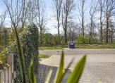 Vanaf de oprit, waar twee auto’s naast elkaar kunnen staan, loop je naar de voordeur van deze duurzame bungalow. Je passeert hierbij de laadpaal en een berging, voor de fietsen en andere spullen.