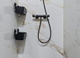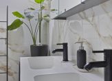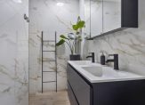 Zwarte kranen, marmerlook tegels en modern sanitair geven de badkamer een prachtige uitstraling. De L-vormige ruimte is ingedeeld met een inloopdouche, een dubbel wastafelmeubel en een spiegelkast. In de naastgelegen toiletruimte zie je een wandcloset, fonteinkastje, stucwerk en fraaie visgraat tegels.
