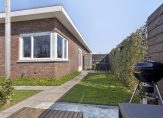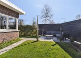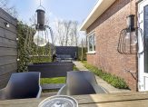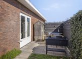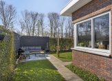 Vanuit de woonkamer is de tuin te bereiken, gesitueerd op het oosten en zuiden. Dankzij de lage bebouwing kun je in deze tuin de hele dag in de zon zitten. Er zijn twee terrassen gemaakt en verder zie je veel groen.