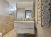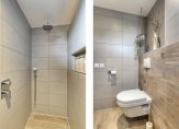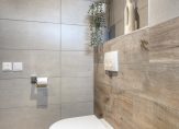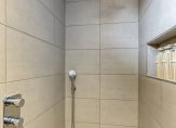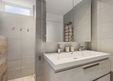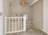 Op de overloop zie je, net als beneden, lichte kleuren die de sfeer bepalen. De paneeldeuren zijn fraai en op de overloop is een vaste trap naar de tweede verdieping. Achter een van de deuren is de badkamer (2017) met een inloopdouche, tweede toilet en een wastafelmeubel met spiegelkast. Houtlook tegels zijn gecombineerd met grote zandkleurige tegels en mooie accessoires, waaronder het handdoekenrek.