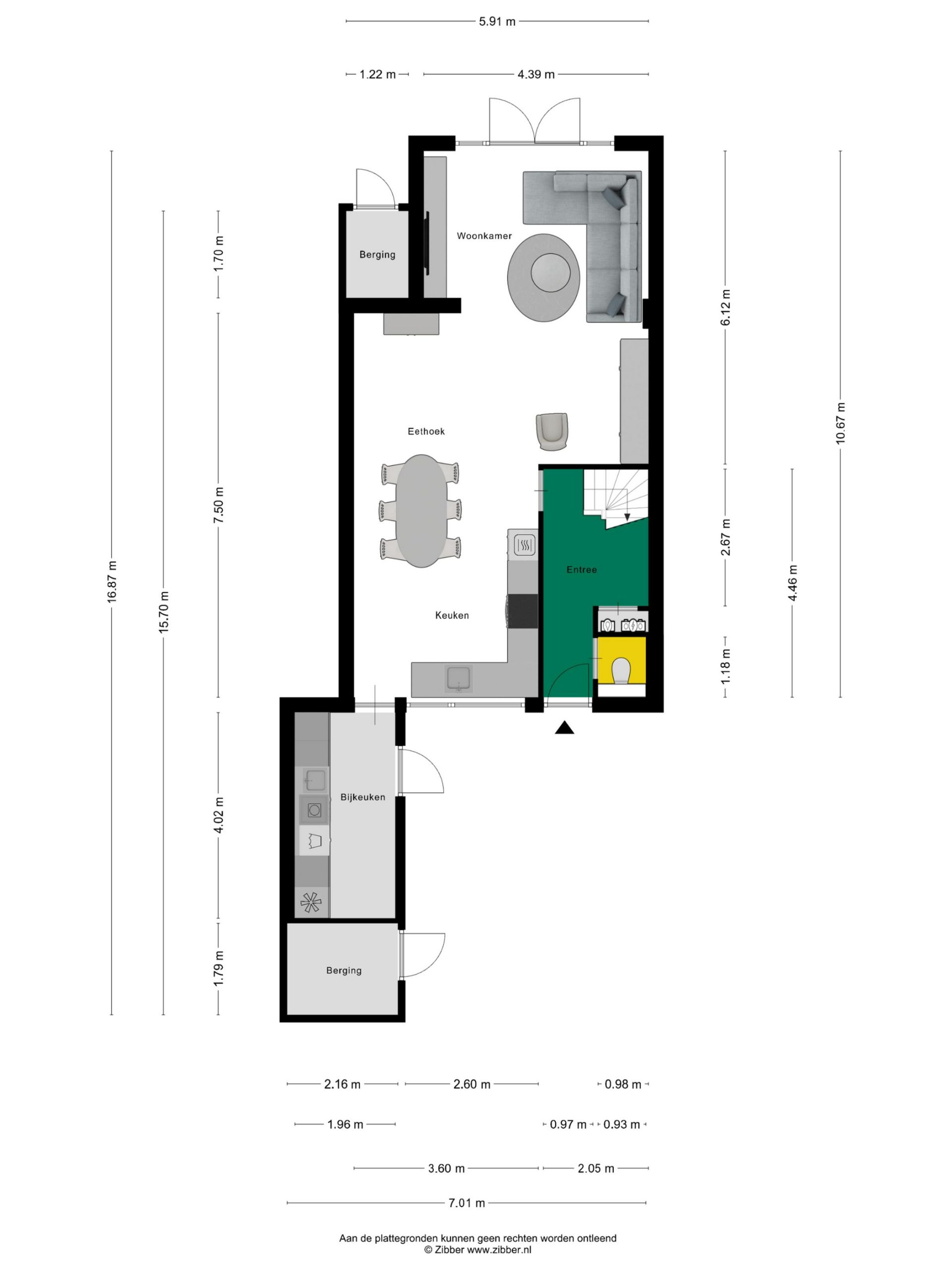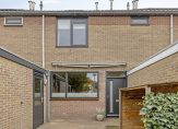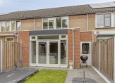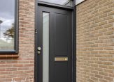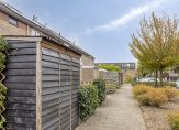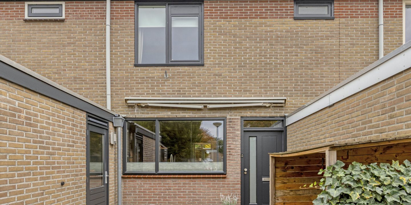 De donkergrijze kozijnen en ramen, de houten (fietsen)berging en de mooie voordeur geven deze woning een mooie uitstraling. Als je de sleutel hebt, dan kun je via de voordeur of de deur van de bijkeuken naar binnen.