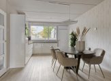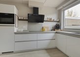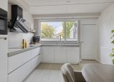 De keuken is in 2020 vernieuwd. Er staat een lichte hoogglans hoekopstelling met een stijlvol aanrechtblad en achterwand, brede lades en kasten bij het spoelgedeelte. Aan beide kanten van de afzuigkap hangt een plank voor kopjes en andere keukenspullen. Verder zijn er een inductie kookplaat, koelkast en een combi-oven ingebouwd. Erg handig is de bijkeuken met een spoelbak, meerdere kasten en de aansluitingen voor de wasapparatuur.