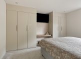 Aan de voorzijde is een ruime slaapkamer, ingericht als kinderkamer. De tweede slaapkamer is aan de achterzijde, net als de master bedroom. In deze kamer is een fraaie kastenwand gemaakt, met een nis om een grote tv aan de muur te hangen.