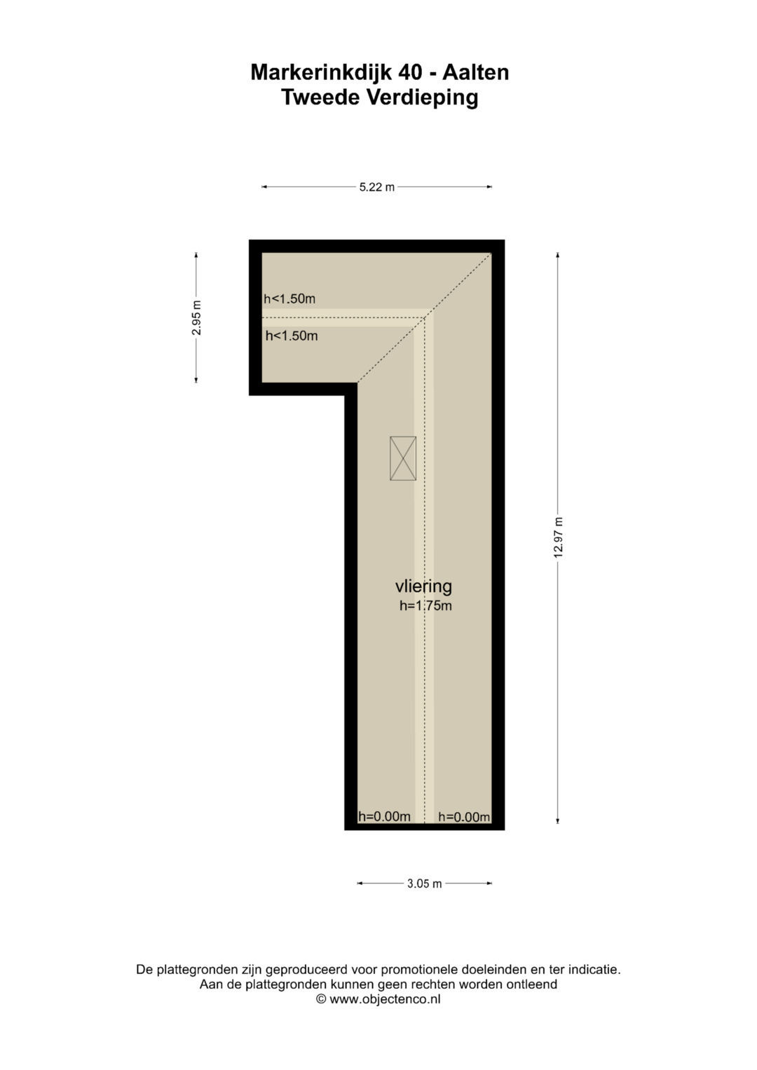 Een vlizotrap geeft toegang tot de zolder, met een nokhoogte van 1.75 meter.