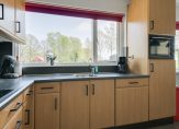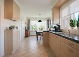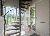 Begane grond: Dit woonhuis, in het rechterdeel van het pand, heeft een ruime hal met de garderobe en toiletruimte. Op de vloer ligt grijs laminaat en bij de trap is een hoge vide. De woonkamer, met grote ramen aan twee zijden, biedt prachtig uitzicht naar de rustige Markerinkdijk en het uitgestrekte landschap. Vanuit de woonkamer en hal is de eetkeuken te bereiken, met dezelfde vloer als in de hal. Voor een grote eettafel is genoeg plek en de hoekopstelling is voorzien van diverse inbouwapparatuur. Naast de keuken is de bijkeuken met een vaste kastenwand, een buitendeur en de opstelling van de wasapparatuur. Gelijkvloers wonen is mogelijk dankzij de slaapkamer en badkamer op de begane grond. De slaapkamer, met vaste kastenwand, bevindt zich aan de achterzijde van het pand. Naast de toiletruimte is de badkamer, ingedeeld met een inloopdouche en een wastafelmeubel.
