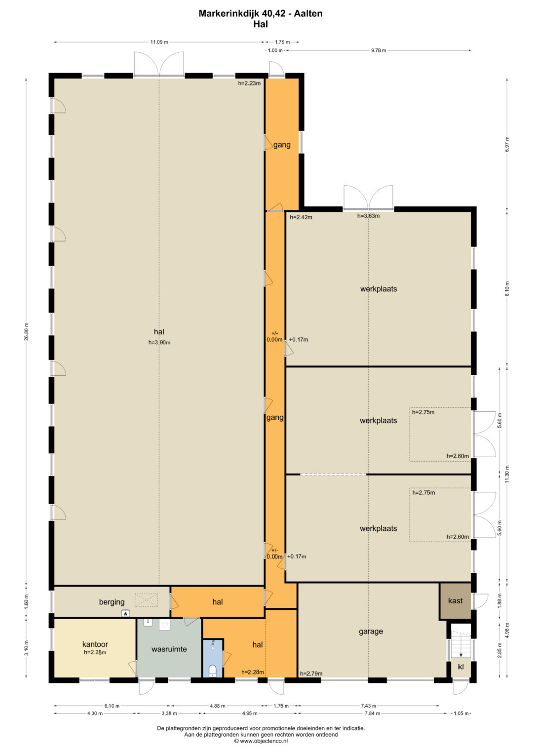 Op het grootste kadastrale perceel staat een voormalig varkensstal met een totale oppervlakte van circa 635 m2. In het rechterdeel zijn een dubbele garage en drie werkplaatsen, elk met een dubbele deur voor een optimale toegankelijkheid. De nokhoogte bedraagt circa 3.63 meter. Ook is er een aparte entree, met een trap naar de kelder van circa 12.1 m2.