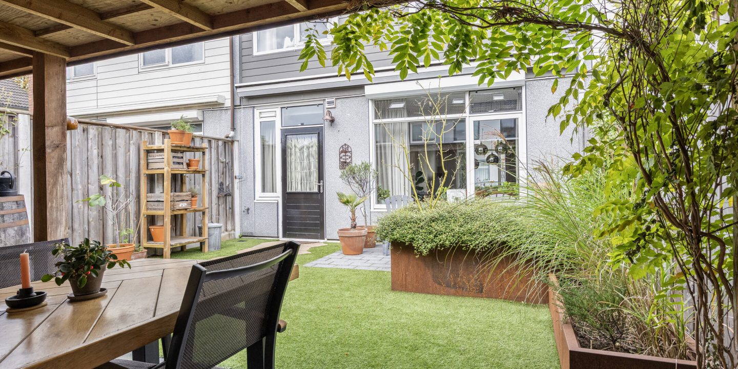 De achtertuin is onderhoudsvriendelijk ingericht met hoogwaardig kunstgras – nooit meer maaien! – en robuuste plantenbakken van cortenstaal in twee hoogtes, wat zorgt voor een speels en modern effect. Achterin de tuin bevindt zich een praktische berging voor fietsen en tuingereedschap, met daarnaast een handige verbrede poort die directe toegang biedt tot de achtergelegen steeg.