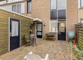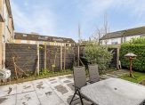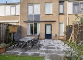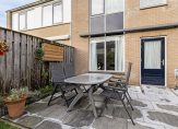De achtertuin op het zuiden is ingedeeld met een groot terras, gevarieerde beplanting en kunstgras. Een deel van de beplanting is groenblijvend en tegen de achtergevel hangt een breed zonnescherm.