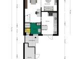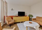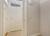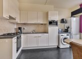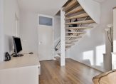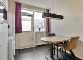 In de hal, aan de linkerzijde, zie je een bergkast en de toiletruimte met fonteintje. Rechts in de hal is de meterkast en een mooie plek om een kast neer te zetten. Vanuit de hal loop je de lichte woonkamer in, die aan de tuinzijde maar liefst 6.10 meter breed is. Op de vloer ligt pvc en de ruimte is goed in te delen met een zithoek, eettafel, een grote kast en een bureau. In de hoek van de woonkamer is de trap naar de eerste verdieping en in een andere hoek hangt een airco-unit waarmee je kunt koelen en verwarmen.