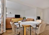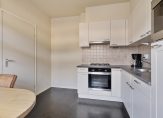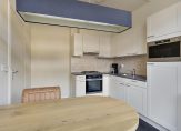 Naast het bureau is een deur naar de ruime keuken, waar een tweede eettafel kan staan. De lichte hoekopstelling met grijs aanrechtblad is in 2016 geplaatst. Aan bergruimte is geen gebrek en de gaskookplaat, afzuigkap, oven (2023) en magnetron zijn ingebouwd.