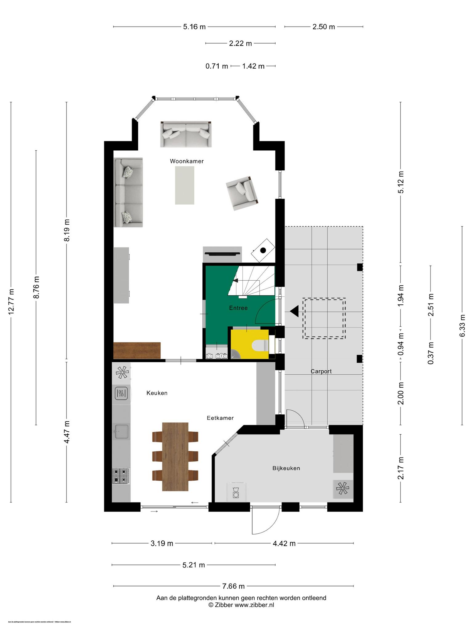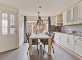 Achter de fraaie deur met ‘glas in lood’ is de eetkeuken, met een schuifpui naar de tuin. Een grote eettafel kan hier ruim staan en de lange wandopstelling met granieten blad is voorzien van diverse inbouwapparatuur: een gaskookplaat, afzuigkap, vaatwasser, koelkast en een combimagnetron. Naast de keuken is de bijkeuken met een deur naar de carport en een deur naar de achtertuin. In de bijkeuken, die door de bewoners als dagelijkse entree wordt gebruikt, is ruimte voor een vriezer en de wasapparatuur.