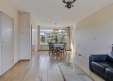 De meer dan 8.50 meter lange woonkamer heeft een prettige indeling, met het zitgedeelte aan de voorzijde en het eetgedeelte aan de achterzijde. Bij het zitgedeelte hangt een airco-unit (koelen/verwarmen) en de eikenhouten vloer past bij verschillende interieurstijlen. Je kijkt niet alleen naar de voor- en achtertuin, maar ook naar een groenstrook aan de overzijde van de rustige straat.