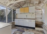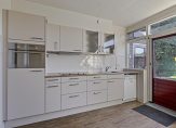 In de dichte keuken, te bereiken vanuit de hal en woonkamer, staat een circa 3.50 meter lange wandopstelling (2012) met een houtlook blad en diverse inbouwapparatuur: een kookplaat (circa 2018), afzuigkap en een combi-oven. Rechts van de spoelbak, onder het aanrechtblad, is plek voor een vaatwasser.