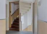 Dit type huis heeft maar liefst vier slaapkamers op de eerste verdieping, twee aan de voorzijde en twee aan de achterzijde. In een van de slaapkamers hangt een wastafel en ook hier zorgen grote ramen voor veel lichtinval.