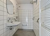 De originele badkamer, met een granitovloer en lichtgele wandtegels, is ingedeeld met een ruime douche, wastafel, handdoekenradiator en een toilet.